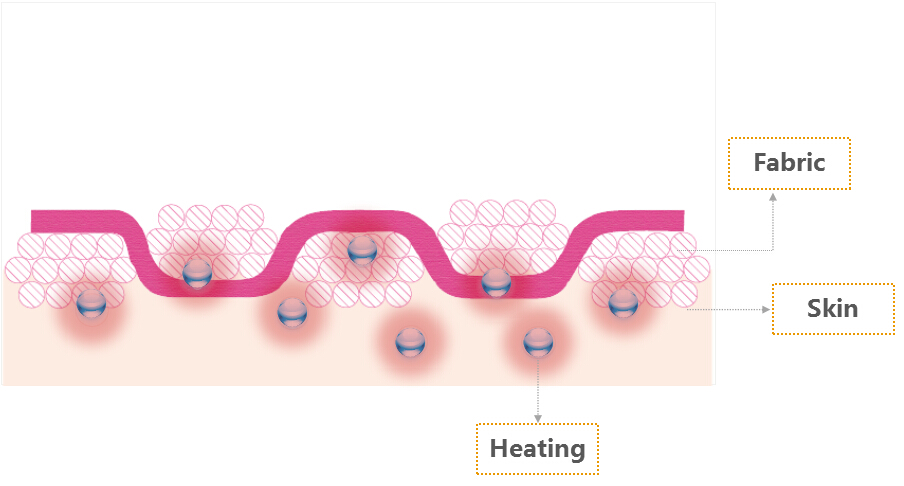 After E-HOT fiber absorbing moisture, it will generate heat. The heat is released during the transformation from kinetic energy to thermal energy of water molecule when the fiber molecule and water molecule combine.